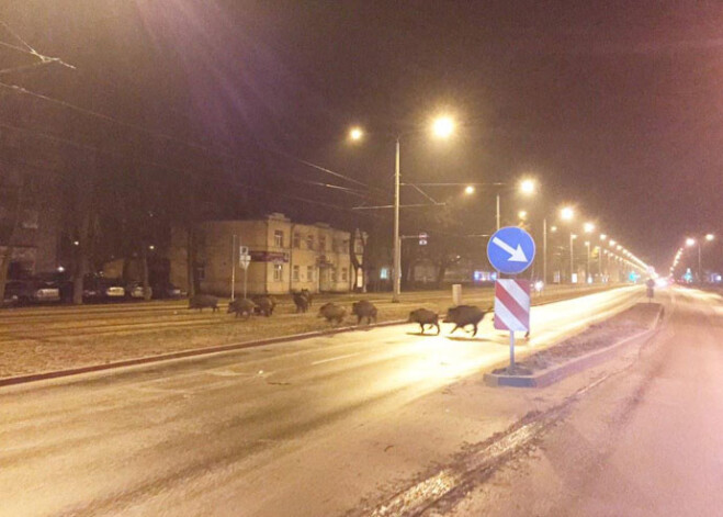 Piemēram, vienā no fotogrāfijām redzams, kā mežacūku bariņš šķērso Brīvības gatvi Juglā pie degvielas uzpildes stacijas "Neste".