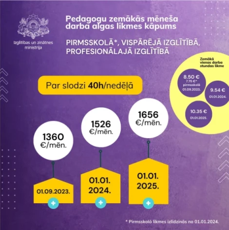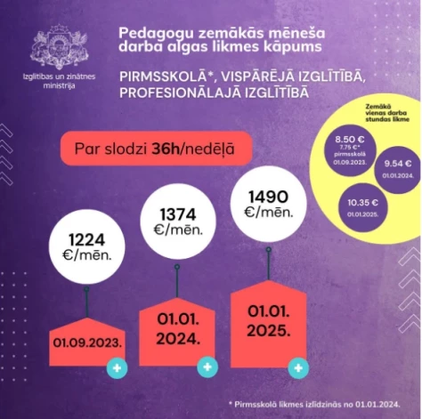 Saskaņā ar valdībā apstiprināto pedagogu darba samaksas pieauguma grafiku, zemākā pedagogu darba algas likme par 36 stundu darba nedēļu no 2025. gada 1.janvāra sasniegs jau 1490 eiro. Jāatgādina, ka iepriekšējais pedagogu minimālās atalgojumu likmes palielinājums līdz 1020 eiro nodrošināts no šā gada 1.septembra.