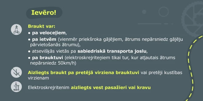 Tāpat elektriskais skrejritenis obligāti jāreģistrē Ceļu Satiksmes Drošības Direkcijā (CSDD), un gan skrejritenim, gan velosipēdam braucot priekšpusē jādeg baltam lukturim, bet aizmugurē – sarkanam. Ektroskrejriteņu un velorikšu reģistrācija veicama līdz 2024. gada 31. martam, un pēc šī termiņa ar šiem transportlīdzekļiem bez to reģistrācijas ceļu satiksmē piedalīties būs aizliegts.