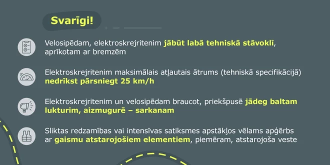 “Šīs izmaiņas veicinās ikviena, īpaši mazāk aizsargāto ceļu satiksmes dalībnieku drošību uz ceļa. Ievērojot noteikumus, ir iespēja būtiski samazināt ar elektroskrejriteņiem un velosipēdiem saistītu nelaimes gadījumu skaitu valstī,” uzsver satiksmes ministrs Kaspars Briškens.