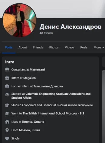 Tāpat šajā kompānijā ir kāds Deniss Aleksandrovs, kurš savā "Facebook" profilā norādījis, ka dzīvo Kanādā, un strādā starptautiskajā finanšu tehnoloģiju uzņēmumā "Mastercard":