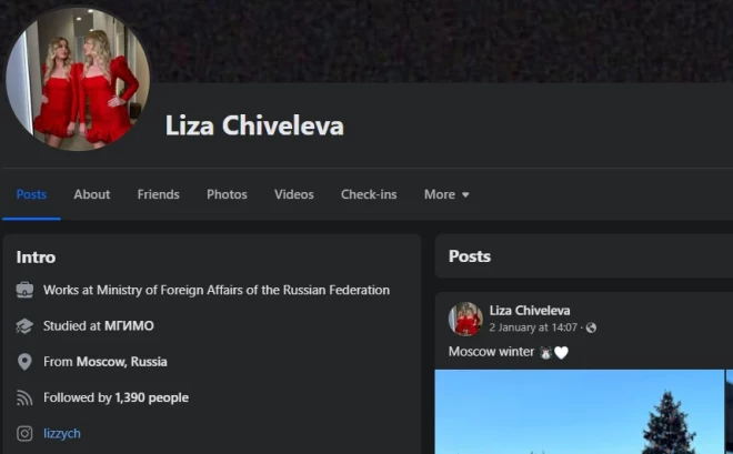 Tur aktīvs ir kāds konts ar vārdu "Liza Chiveleva". Izglītība un arī darbavieta - Krievijas Ārlietu ministrija - sakrīt ar vēstniecības resursos pieminēto diplomāti: