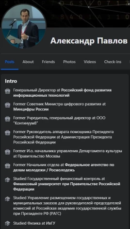 "Facebook" norādītā informācija arī liecina, ka Pavlovam ir ilgstoša pieredze darbā Krievijas valsts pārvaldes struktūrās.