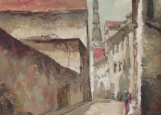 Arī otru izsolē visaugstāk novērtēto latviešu mākslinieku bēgļu gaitas aizveda uz ASV. 5800 eiro sākumcena ir Ludolfa Liberta (1895 – 1959) darbam “Vecrīga, Alksnāja iela” (kartons/eļļa, 61x50 cm).