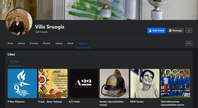 Par "Stabilitātei!" rindās esošā Sruoģa skatījumu uz lietām kaut ko pasaka arī viņa "Facebook" profils, kurā Sruoģim pie interesēm atrodamas 9. maija tā saucamajiem "uzvaras svētkiem" veltītas grupas: