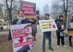 Rīgā pie valdības ēkas šorīt sapulcējušies padsmit cilvēku, la protestētu pret "asiņaino" mangāna rūdas tranzītu caur Latviju uz Krieviju.