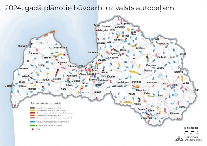 Šogad dažādu veidu darbi plānoti aptuveni 450 kilometros valsts autoceļu un 12 tiltiem. Plašākie darbi notiks uz reģionālajiem autoceļiem – 220 kilometros – un uz valsts vietējiem autoceļiem – 159 kilometros. Uz valsts galvenajiem autoceļiem darbi notiks 71 kilometrā, vēsta "Latvijas Valsts ceļi".