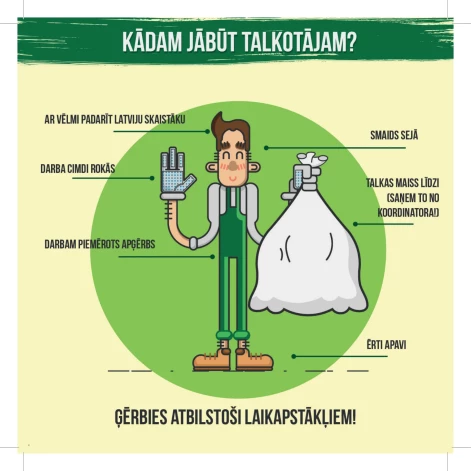 Talkojot noteikti lieto darba cimdus! Iesakām vilkt garās bikses un kreklu vai jaku ar garām piedurknēm. Kājās velc slēgtus apavus ar pietiekami cietu, biezu zoli, lai pēdās neieduras kāds nepamanīts stikls vai ass priekšmets. Galvā liec cepuri vai lakatu. Šāds apģērbs Tevi pasargās arī no ērču kodieniem!