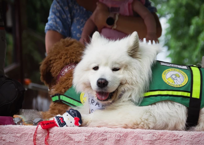FOTO: spītējot negaisam, Imantas tirgū labdarības pasākumā vāc līdzekļus "ķepu terapijas" projektam - īpaši apmācītiem suņiem, kas slimnīcā veicina bērnu atveseļošanos
