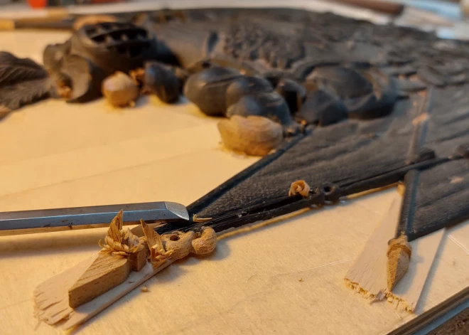 Izmantots kvalitatīvs materiāls – ozolkoks, darbs veikts ļoti profesionāli, smalki, visaugstākajā kokgriezuma kvalitātē. “Man visu laiku bija sajūta, ka strādāju kā ar jēlu olu – pats mazākais galiņš var tikt nejauši traumēts un pat nolūzt. Cerams, ar laiku izveidosim arī ietvaru, lai nejaušības pēc netiktu bojātas kokā izgrieztās smalkās daļas,” teic Pilenieks.