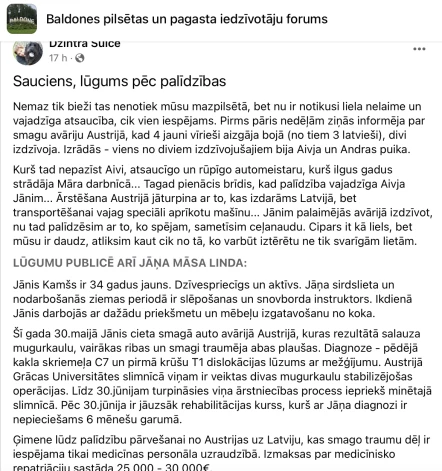 "Kurš tad nepazīst Aivi, atsaucīgo un rūpīgo automeistaru, kurš ilgus gadus strādāja Māra darbnīcā... Tagad pienācis brīdis, kad palīdzība vajadzīga Aivja Jānim... Ārstēšana Austrijā jāturpina ar to, kas izdarāms Latvijā, bet transportēšanai vajag speciāli aprīkotu mašīnu... Jānim palaimējās avārijā izdzīvot, nu tad palīdzēsim ar to, ko spējam, sametīsim ceļanaudu. Cipars it kā liels, bet mūsu ir daudz, atliksim kaut cik no tā, ko varbūt iztērētu ne tik svarīgām lietām," vēstīts "Facebook" ierakstā.
