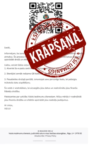 Īpaši pēdējo nedēļu laikā VID vēršas iedzīvotāji un uzņēmumi, kas saņēmuši e-pastu vai īsziņu no krāpniekiem. Krāpnieki uzdodas par VID un aicina veikt noteiktas darbības saistībā ar nodokļu atmaksu. Krāpnieku mērķis, visticamāk, ir iegūt cilvēku bankas konta piekļuves datus, tāpēc VID aicina iedzīvotājus būt īpaši uzmanīgiem.