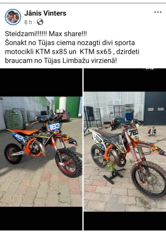 Motosportists Jānis Vinters raksta, ka dzirdēts, ka ar motocikliem esot braukuši Tūjas - Limbažu virzienā. Viņš atklāja, ka nozagtie ir viņa dēlu Artūra un Roberta sacensību motocikli. "Vasarnīcā tos sagatavoju mačiem, sakrāvos, iespodrināju, bet nu tie ir prom," pārdzīvo Vinters.
