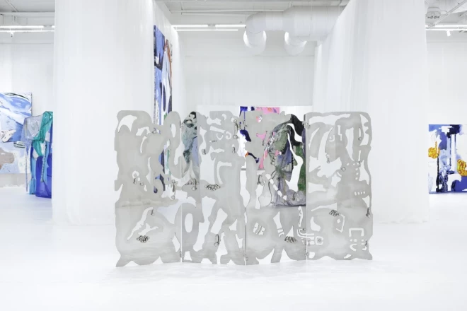 Izstādē UTOPISKĀS ŠŪNAS Donna Huanka rada daudzpusīgu un dinamisku telpu, kurā apmeklētāji kļūst par būtisku instalācijas daļu, viņu kustībām mijiedarbojoties ar mākslinieces faktūru valodu.