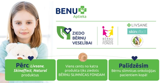 Ikvienam BENU Aptiekas klientam ir iespēja piedalīties labdarības kampaņā, iegādājoties Livsane, Skineffect un Natural zīmolu produktus. Pērkot šo zīmolu produktus, 1 cents no katra produkta tiks ziedots Bērnu slimnīcas fondam. Ikviens ziedojums ir būtisks, lai palīdzētu! Savukārt par citām iespējām ziedot Bērnu slimnīcas fondam lasiet fonda mājaslapas ziedošanas sadaļā.