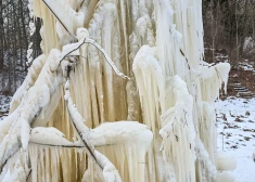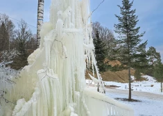 "Dodaties izbaudīt ledus laikmetu," pie foto norādījusi Ginta. Vērienīgais ledus veidojums izslējies vairāku metru augstumā un to izgreznojušas dažāda garuma lāstekas, kas vairāk atgādina mākslas darba ornamentus. Jautāta, vai attēlos redzamais dabas veidojums ir radies dabiski, Ginta Jauns.lv norāda, ka "saimnieks norādījis, ka skulptūra tapusi cilvēkam sadarbojoties ar dabu."