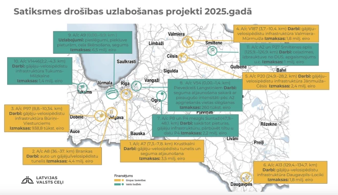 Satiksmes drošība valsts autoceļu tīklā katru gadu tiek uzlabota, realizējot autoceļu pārbūvi, kā arī atsevišķus satiksmes organizācijas uzlabošanas projektus. Šogad plānots pilnībā realizēt vai uzsākt 11 šādus projektus, informē VSIA "Latvijas Valsts ceļi"