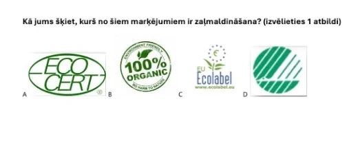 Aptaujā identificējamie eko marķējumu piemēri, no kuriem trīs ir oficiāli un viens nepareizs (variants B).