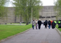 9. maijā pie Salaspils nometnes memoriālā cilvēki tuprina nolikt ziedus.