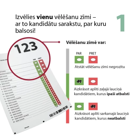 Ja vēlies paust pozitīvu vai negatīvu attieksmi pret kādu konkrētu kandidātu, tad vēlēšanu zīmē iekrāso viņa vārdam iepretī esošo sarkano vai zaļo lauciņu, var arī tur ievilkt krustiņu vai ķeksīti. Galvenais, lai būtu labi redzama lauciņā izdarītā atzīme.