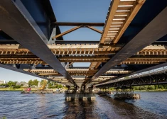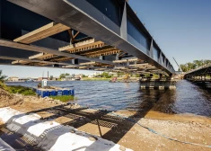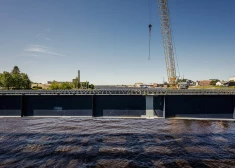 FOTO: jaunā Salacas tilta būvniecība virzās uz priekšu: pabeigta laiduma siju uzbīdīšana
