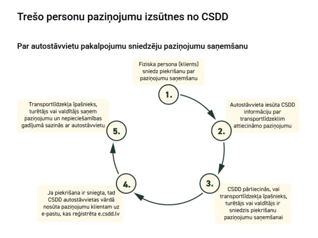 Saņemot no autostāvvietas informāciju par transportlīdzekli (valsts reģistrācijas numurus), CSDD identificē transportlīdzekļa īpašnieku, turētāju vai valdītāju un pārbauda, vai ir saņemta piekrišana paziņojuma izsūtnei.