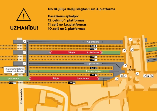 Būvdarbu laikā tiks daļēji slēgti atsevišķu platformu posmi un mainītas pasažieru iekāpšanai/izkāpšanai paredzētā vietas. Pasažieri aicināti ieplānot papildu laiku nokļūšanai uz vajadzīgo platformu!