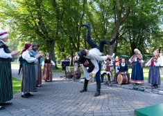 Latvieši un japāņi metas jestrā "Ādamam bij’ septiņ’ dēli" dejā Vērmanes dārzā, kur notiek tiešraide uz Osakas EXPO. FOTO