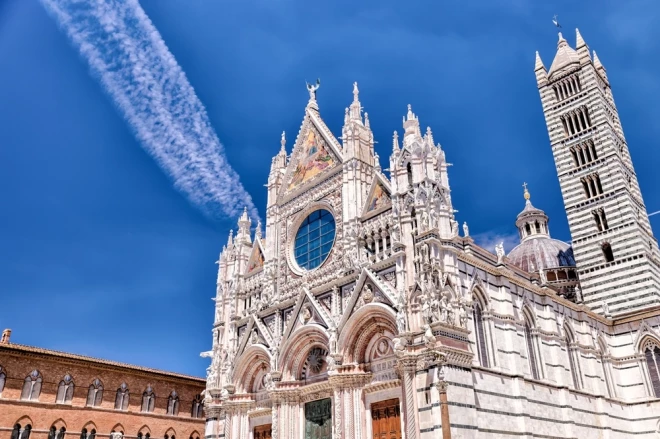 Sjēnas katedrāle, kuras celtniecība sākās XIII gadsimtā, ir viena no skaistākajām gotikas stila baznīcām Itālijā. Tās melnbaltās marmora joslas simbolizē Sjēnas pilsētas krāsas, savukārt dievnama iekšpusē pārsteidz bagātīgi greznais interjers ar Pisano, Donatello un Mikelandželo mākslas darbiem. Apskates vērta ir arī mozaīkas tehnikā darinātā grīda – viena no unikālākajām Eiropas sakrālajā arhitektūrā. Grīdas mozaīkas tapušas divsimt gadu garumā, no 14. līdz 16. gadsimtam, un to veidošanā piedalījušies vairāk nekā četrdesmit renesanses laika mākslinieku. Patiesību sakot, ar pieciem teikumiem ir par maz, lai aprakstītu šo katedrāli, kura ir ne tikai reliģiska celtne, bet arī dzīva mākslas grāmata, kas aptver gadsimtus.