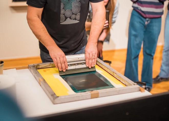 FOTO: Liepājas muzejā norisinājās mākslinieka Jāņa Murovska sietspiedes meistarklase