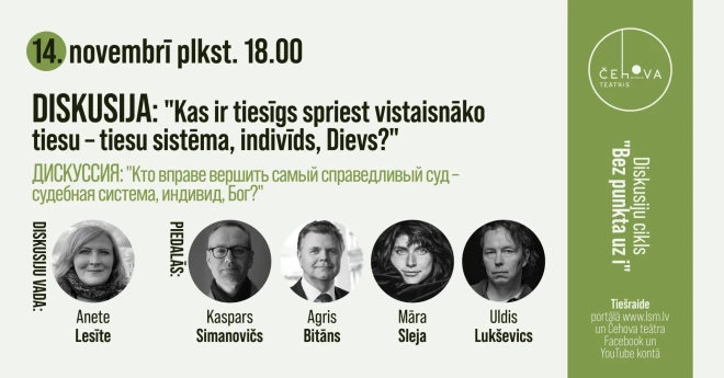 14. novembrī plkst. 18.00 Mihaila Čehova Rīgas Krievu teātrī notiks publiska diskusija "Kas ir tiesīgs spriest vistaisnāko tiesu - tiesu sistēma, indivīds, Dievs?" saruna diskusiju cikla "Bez punkta uz i" ietvaros.