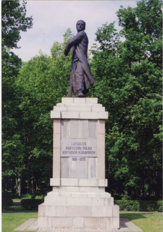 Piemineklis atklāts 1938. gada augustā. Četrus metrus augstais un trīs tonnas smagais „Sargājošā partizāna” bronzas tēls atliets Somijā pēc tēlnieka Kārļa Jansona meta, bet piecus metrus augstais pieminekļa pamats tika celts no vietējiem laukakmeņiem. Padomju okupācijas vara 1941. gada aprīlī pieminekli nojauca. Atjaunots 1943. gada rudenī. Otrreiz tas nojaukts pēc 2. pasaules kara. Atkal atjaunots 1993. gada 11. novembrī. Uz pieminekļa priekšpusē teksts: „Latgales partizānu pulka kritušajiem karavīriem 1919-1920”, otrā pusē: „Atjaunots godinot arī 1940.-1954. gada Latgales nacionālas brīvības cīnītājus”.