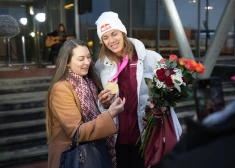 FOTO: lidostā sirsnīgi sagaida pasaules čempioni pludmales volejbolā Tīnu Graudiņu