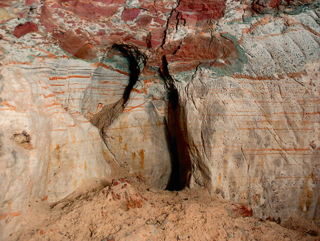 Oskars spīdina lukturi alas dzīlēs, rādot, kā mainās iežu struktūra. Baltajā iezī ir zilā māla ieslēgumi, tālāk sienas iekrāsojas violetas. Sienas ir strīpainas no raupjāku un smalkāku darbarīku nospiedumiem. Cara laikos par alas izciršanu tika maksāti pieci zelta rubļi. “Viss bija atkarīgs no apjoma, profesijas „alu racējs” nekad nav bijis, bet, ja bija kāds, kas maksā, piestrādāt varēja,” saka gids.
