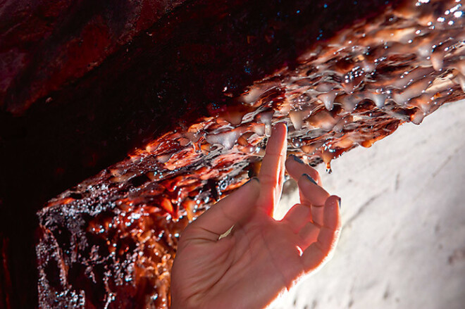 Gaismas strēmele apspīd tādas kā lāstekas, kas nokarājas no koka durvju ailes. Izskatās pēc stalaktītiem. Pieskaros, veidojums notrīs, bet nenokrīt. Ūdens sūcas cauri cementam un pēc tam vēl kokam, ceļā izskalojot sāļus un radot receklim līdzīgo subproduktu. Līgatnē ir atrodami dabiski stalaktīti – dolomīta alā Līgatnes upes krastā. Stalaktītu veidošanās process ir ārprātīgi lēns – daži milimetri tūkstošgadēs.