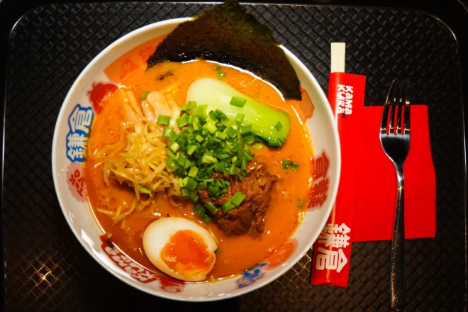 Galvenajā lomā, protams, ir rameni – Japānas populārākais ēdiens. Kamakura tiek gatavots klasiskais paitan – bagātīgs japāņu buljons uz vistas, dārzeņu un garšvielu bāzes. To vāra aptuveni septiņas stundas, panākot biezu, pienainu tekstūru, kas ir īpaši bagāta ar kolagēnu. Uz šī buljona pamata tiek piedāvāti četri ramena veidi. Vegāniskais variants tiek gatavots atsevišķi un prasa gandrīz diennakti – tā pamatā ir kombu aļģes un kaltētas šiitaki sēnes. Visi rameni ir ļoti sātīgi – viena porcija sver aptuveni vienu kilogramu.
