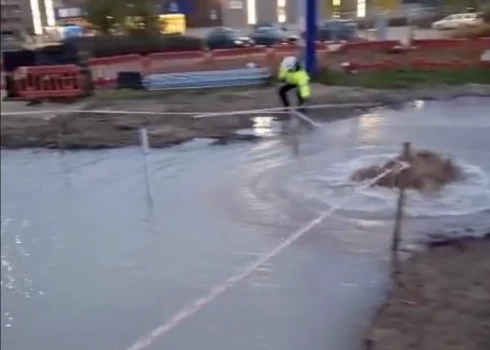 Notikuma vietā no tekošā ūdens ceļas tvaiki, kas varētu liecināt par siltumtrases avāriju vai karstā ūdens cauruļvada plīsumu.