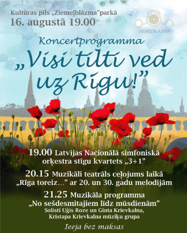 Savukārt, kultūras pils „Ziemeļblāzma” parkā (Ziemeļblāzmas iela 36) plkst. 19.00 koncertprogramma „Visi tilti ved uz Rīgu!”. Dalībnieku vidū Latvijas Nacionālā simfoniskā orķestra stīgu kvartets „3+1”, izpildot pagājušā gadsimta sākuma latviešu mūzikas pērles un mūsdienīgas Eiropas melodijas. Ikvienam pasākuma apmeklētājam būs iespēja arī ceļot laikā muzikāli teatrālā uzvedumā „Rīga toreiz...”, kurā Mariss Vētra (Latvijas Nacionālā teātra aktieris Juris Jope) stāstīs un dziedās par šī laika daudznacionālo galvaspilsētu. Bet vakara noslēgumā programmā „No sešdesmitajiem līdz mūsdienām” uzstāsies solisti Uģis Roze, Ginta Krievkalna un Kristapa Krievkalna mūziķu grupa.