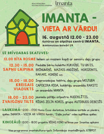 Pasākumā „Imanta – vieta ar vārdu” no plkst. 12.00 ikviens aicināts pirmoreiz tik vērienīgi svinēt Rīgas svētkus tās kreisajā krastā - Pārdaugavas apdzīvotākajā apkaimē Imantā brīvdabas pasākumā pie kultūras un atpūtas centra „Imanta” (Anniņmuižas bulvāris 29). Pavisam neparasts priekšnesums būs programmā „Kreisais viadukts”, kad uz skatuves kāps improvizācijas teātris, „Mojubá Capoeira Riga” kopā ar perkusionistiem, demonstrējot cīņas dejas. Uzstāsies arī ansamblis „Manta”. Svētku noslēguma daļā koncertprogramma „Zvaigžņu tilts”, piedaloties jauniešu pūtēju orķestrim „Auseklītis” un „Rīgas Zelta korim”, kā arī grupai „Autobuss debesīs”. Visas dienas garumā notiks dažādas videi veltītas radošās darbnīcas sadarbībā ar biedrību „Homo Ecos:” un „Zaļā josta”, kā arī brīvdabas izstāde, plenērs un mākslas darbnīca. Bet kultūras un atpūtas centra „Imanta” kinozālē tiks demonstrētas Nacionālā kino centra projekta „Rīgas kino” ietvaros 2014. gadā tapušās jauniešu īsfilmas par Imantas apkaimi.