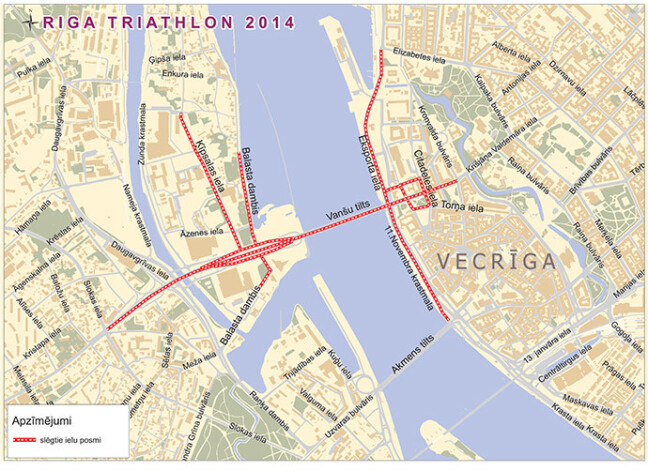 No plkst. 7.00 līdz 17.00 tiks slēgta transportlīdzekļu satiksme triatlona distancēs (izņemot sabiedrisko un vietējo iedzīvotāju transportu):