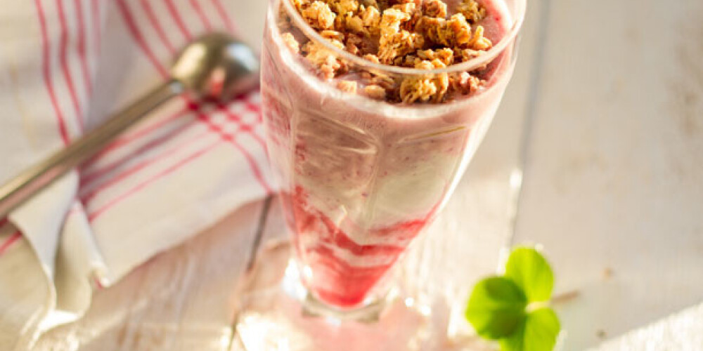 Zemenes (var būt saldētas) sablendē ar 1 ēd.k. agaves sīrupu un uzreiz pārliek porcijas glāzē. Uzmanīgi pa virsu uzlej kokoksa pienu. Pa virsu liek 1 ēd.k. granolas. Tad sablendē banānu, ūdeni, sukādes ar 1 ēd.k. agaves sīrupu un to pārlej pāri granolai. Pa virsu pārkaisa ar granolu.