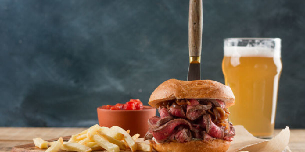 Maizītes sagriež uz pusēm un apgrauzdē uz sausas pannas. Apakšējo maizītes daļu apsmērē ar majonēzi. Tad pa virsu kārto gaļas škēles un karamelizētus sīpolus. Apsedz ar augšējo maizītes daļu.
