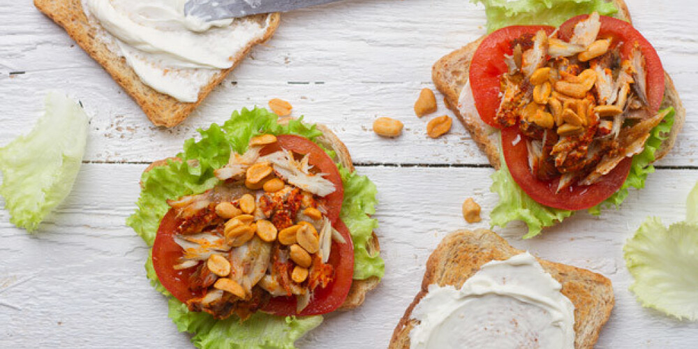Maizi apsmērē ar sieru. Uz vienas maizes šķēles kārto salātu lapiņas un tomātus, pārkaisa ar sāli un svaigi maltiem pipariem. Tad liek zivi un riekstus. Apsedz ar otru maizes šķēli. Šīs pašas darbības atkārto ar parējām maizēm. Lai labi garšo!