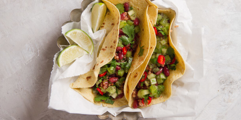 Uz tortillas kārto pupiņas un salsu, pa virsu pārkaisa ar sasmacinātu čili piparu, satin un uzreiz pasniedz.