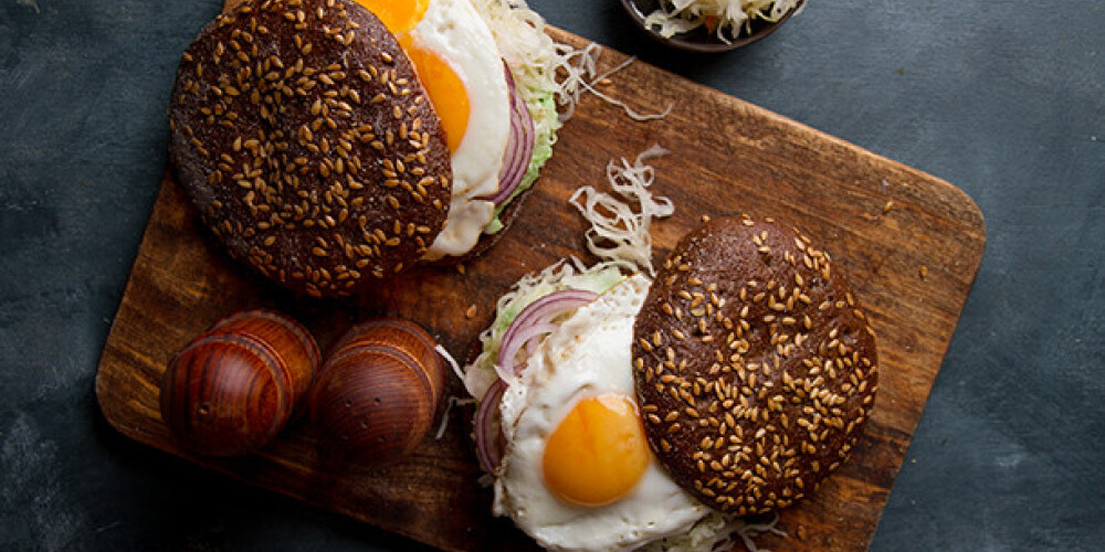 Ar avokado mērci iesmērē doniņu apakšējās daļas. Tad liek pa virsu skābētus kāpostus, sīpolu gredzenus un ceptas olas. Apsedz ar augšējām doniņu pusītēm un uzreiz pasniedz.