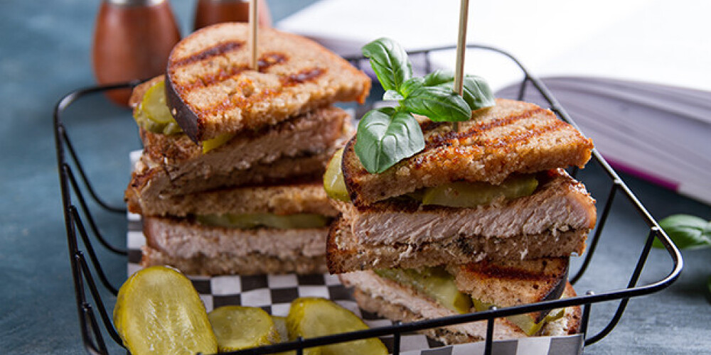 Tagad liek sendviču kopā. Uz četrām maizes šķēlēm uzsmērē nežēlojot sviestu. Liek pa vienai karbonādei, sagrieztus marinētus gurķus un apsedz ar atlikušām maizes šķēlēm.