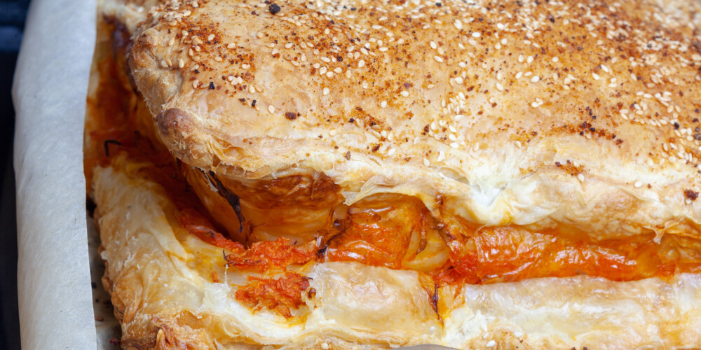 Veidnē izklāj kārtaino mīklu, liec pa visu pildījumu un pārklāj ar atlikušo mīklu. Cep cepeškrāsnī 35-40 minūtes 200 grādu temperatūrā.