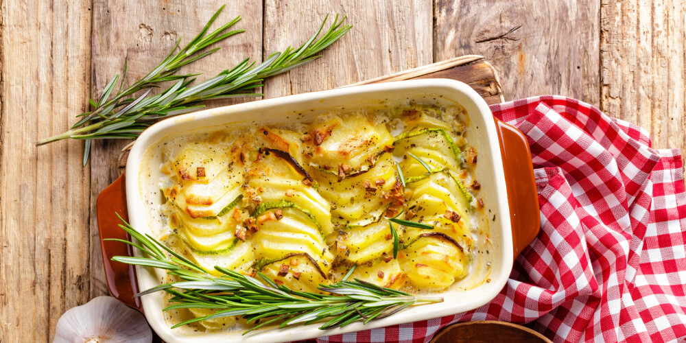 Liec sagatavotajā pannā kartupeļu kārtu, tad sīpolu kārtu, sasāli, sapiparo. Atkārto, līdz visi dārzeņi izmantoti. Virsū uzliec sviesta piciņas, pārlej ar pienu. Liec krāsnī uz 40–50 minūtēm. Gatava sacepuma virspuse būs zeltaini brūna, bet iekšpuse – krēmīgi mīksta.