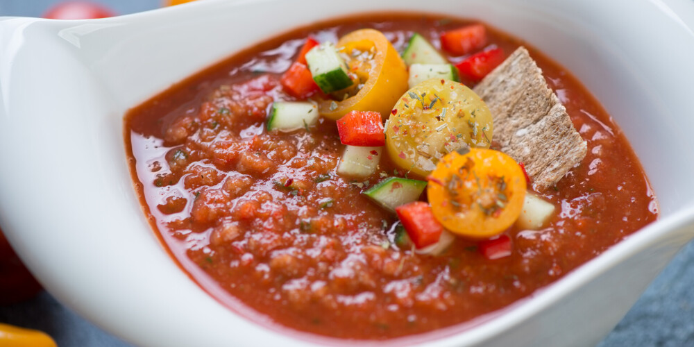 Visus dārzeņus un maizi, izņemot pataupīto, blendē. Pamazām pievieno etiķi, eļļu un tomātu biezeni.