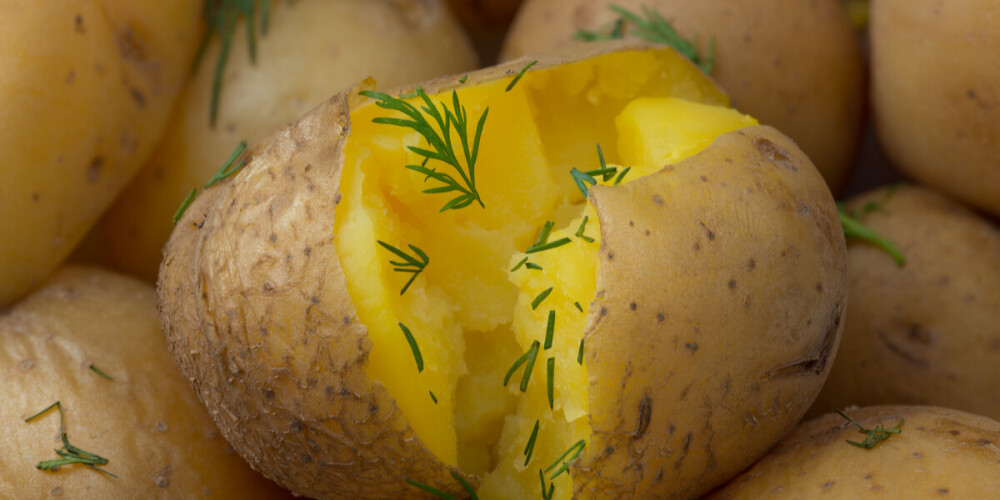 Kartupeļus krusteniski iegriez un liec virsū biezpienu. Pārkaisi ar maurlociņiem.